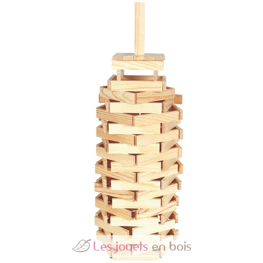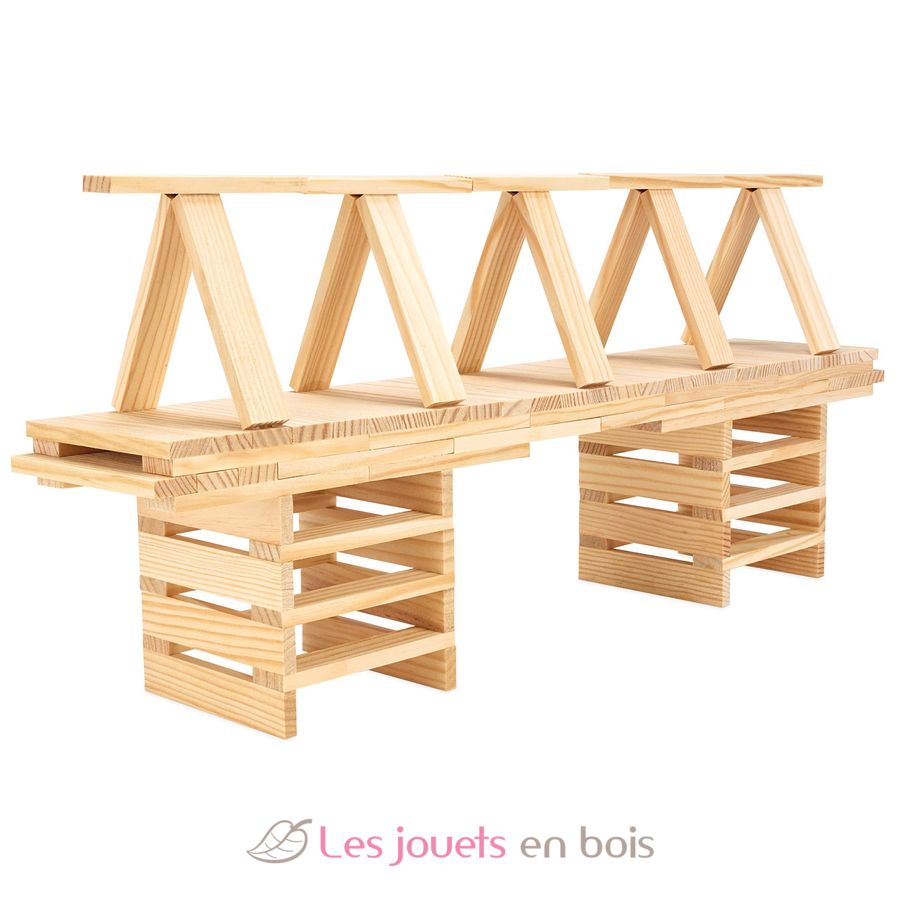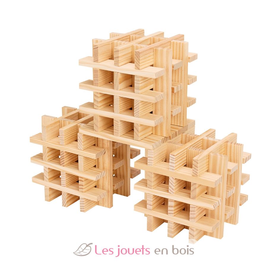 Juego de construcción compuesto por 100 tablillas de madera natural, fabricado en Francia.