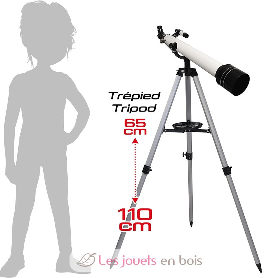 Tubo totalmente metálico. Apertura de 60 mm y distancia focal de 700 mm. Incluye tres oculares intercambiables: uno Kellner de 20 mm, otro de 6 mm y otro de 10 mm. Trípode de aluminio con dos posiciones de altura: 65 cm y 110 cm.