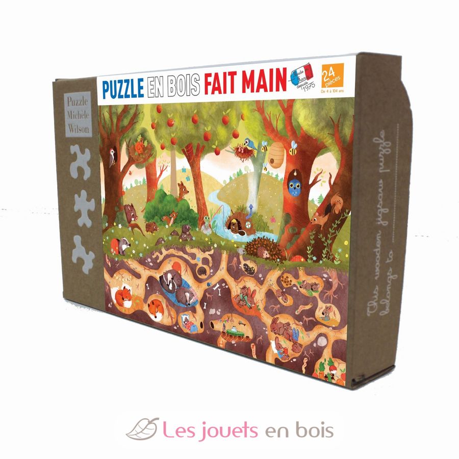 Un puzzle de madera de 24 piezas fabricado en Francia por Michele Wilson. Rompecabezas de madera para niños a partir de 4 años.