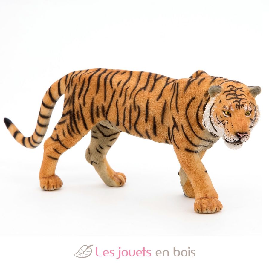 Originario de Asia, este imponente mamífero carnívoro es el mayor felino del planeta. Es fácilmente reconocible por su pelaje naranja y sus distintivas rayas negras. Cuando caza, este temible depredador se alimenta principalmente de ciervos, jabalíes, búfalos y, a veces, incluso de cocodrilos. Originario de Asia, el tigre se considera una especie en peligro de extinción y actualmente está protegido. El tigre, una hermosa estatuilla sobre el tema de los animales salvajes, cuidadosamente pintada a mano y modelada de forma muy realista. Las figuritas de Papo se convertirán rápidamente en la base de una colección que se enriquecerá progresivamente para el despertar y el descubrimiento de su hijo.