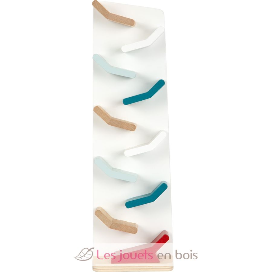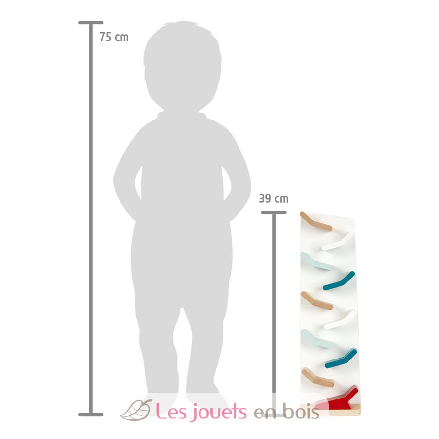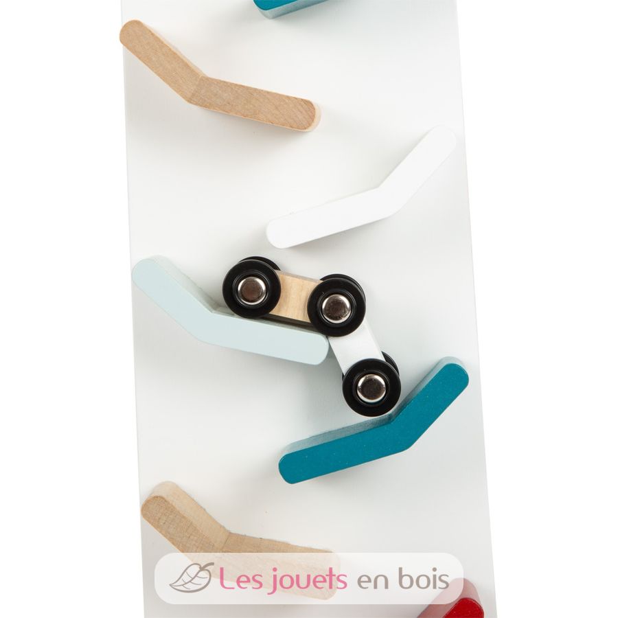 Un juguete de madera relajante y fascinante. Una vez liberado en la parte superior, el coche articulado y móvil zigzaguea por la pista por sí solo, dando rápidas volteretas. Cada bajada se convierte en una experiencia y la torre de la cascada en una ocupación duradera en la habitación del niño. Los colores modernos combinados con el blanco y la madera natural lo convierten en un artículo de decoración de moda.