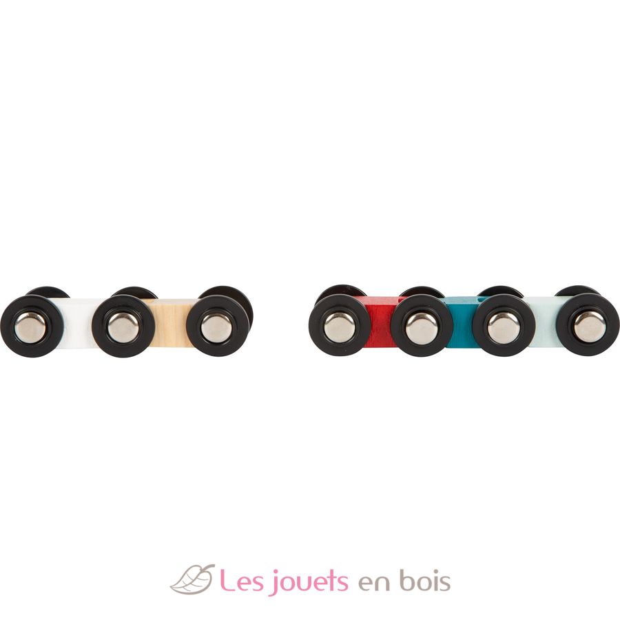 ¡Diversión desenfrenada! Esta torre de madera en cascada atrae la atención de todos cuando los coloridos vehículos articulados bajan a toda velocidad por los escalones de la pista de carreras con un divertido sonido de clac y luego continúan un poco más allá en el suelo a toda velocidad.
