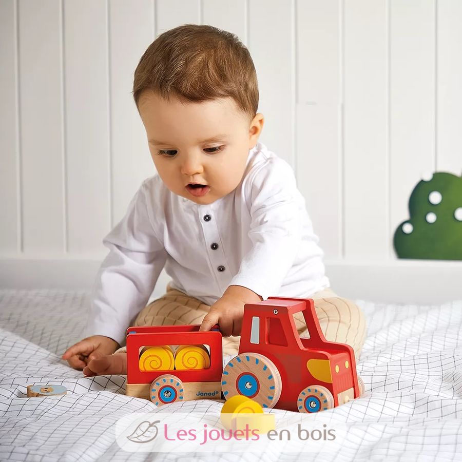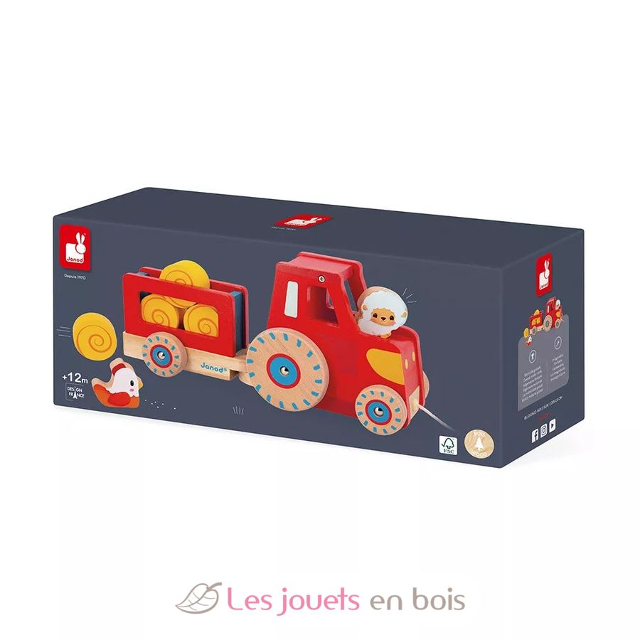 Tractor de tracción, un juguete de madera de la marca Janod. Referencia J03317.