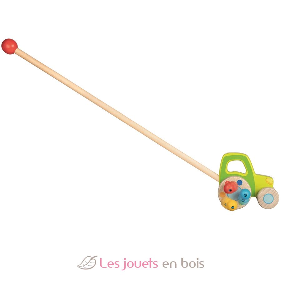 El tractor empujable con las perlas. Un juguete que es un gran estímulo para el juego y el movimiento.