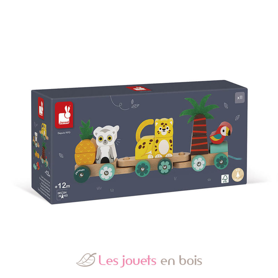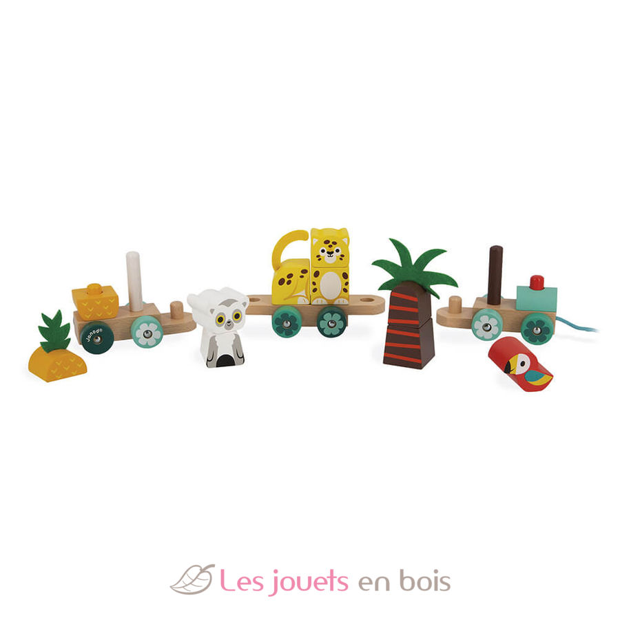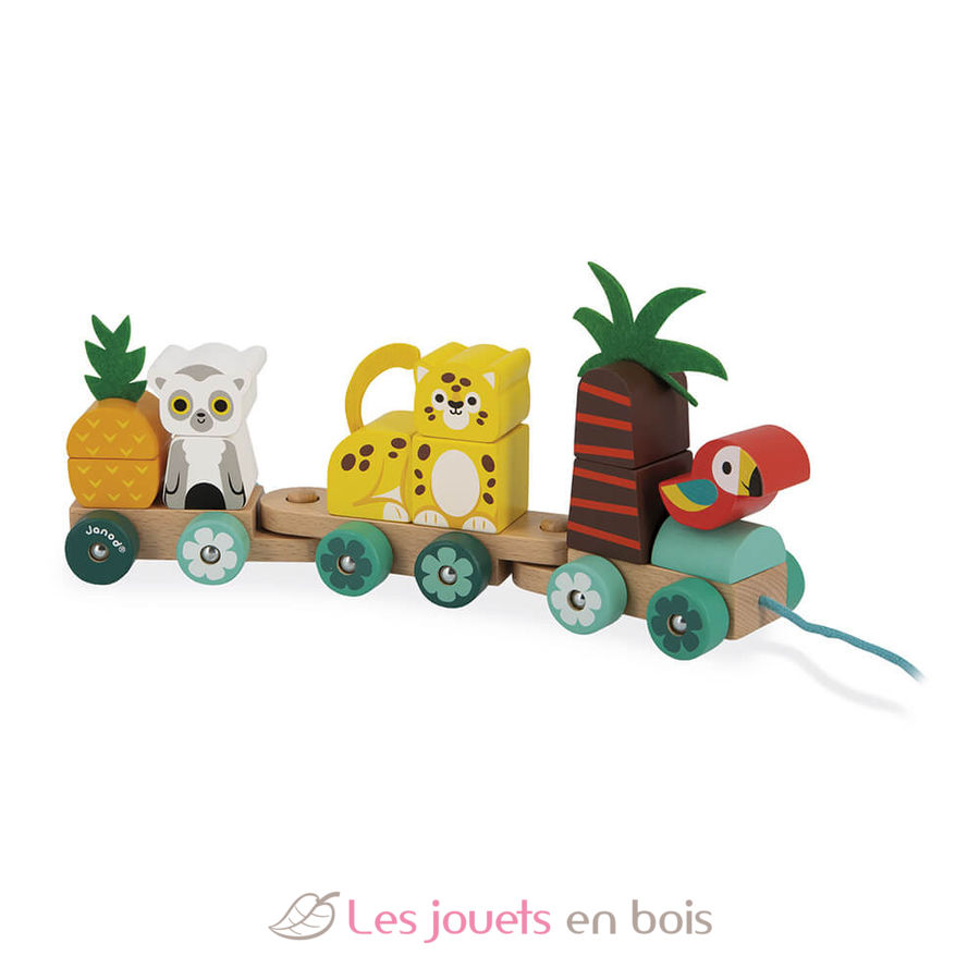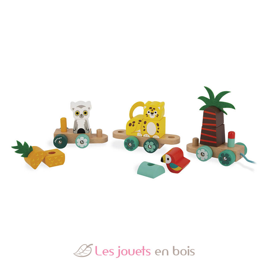 ¡Chuuu, Chuuu! ¡Es hora de vivir grandes aventuras por la selva tropical! Un juego de aprendizaje 2 en 1: juguete de arrastre y juego de construcción para niños a partir de 12 meses. Este tren de madera está compuesto por 3 vagones y 11 piezas apilables para construir un loro, una palmera, un jaguar, una piña o un lémur. Además, podrá tirar la cuerda de algodón para pasearlo por todo la casa. Este juguete de madera y fieltro es ideal para estimular la motricidad fina, la coordinación mano-ojo y animarle a moverse mientras desarrolla la motricidad gruesa. Tren Tropical de arrastre Tropik, un juguete de madera de arrastre de la marca Janod. Referencia J08272.