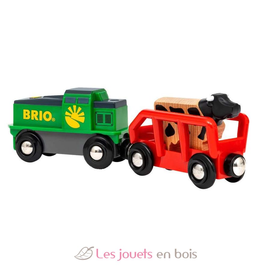 Lleva a los animales a pastar con la locomotora granjera a pilas. Con un diseño pensado para los niños pequeños, este tren de juguete a pilas cuenta con una sencilla función de «toca y activa» para jugar sin frustraciones. Pulsa hacia abajo en la parte delantera de la locomotora para que comience a moverse. Para detenerla, vuelve a pulsar hacia abajo. Pon la vaca o la carga de heno de madera en el vagón y únelo al tren de juguete con los conectores magnéticos Brio antes de partir.