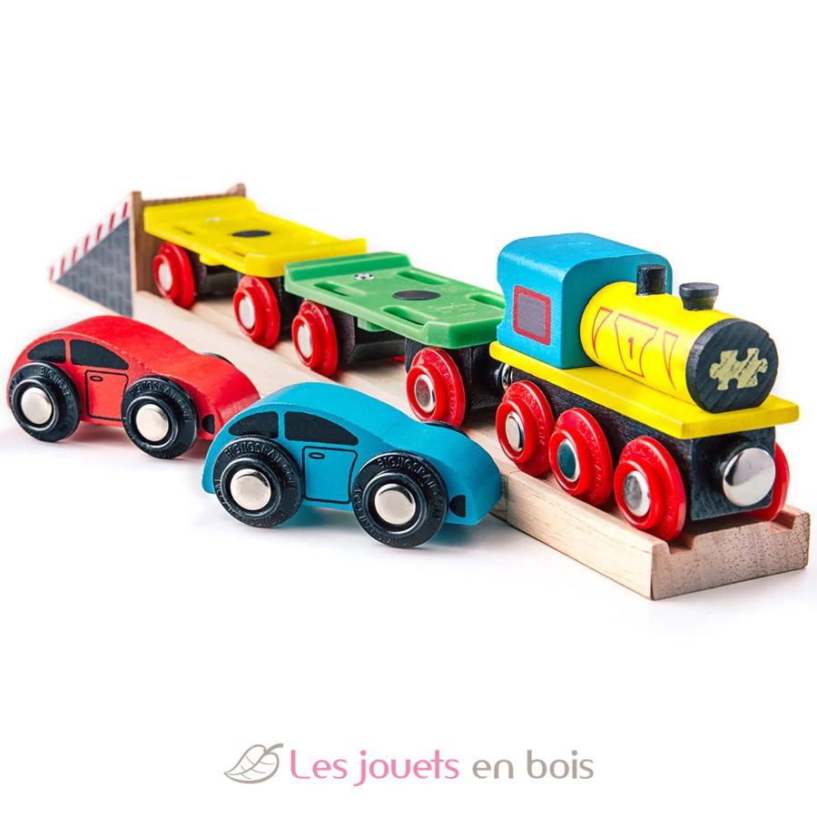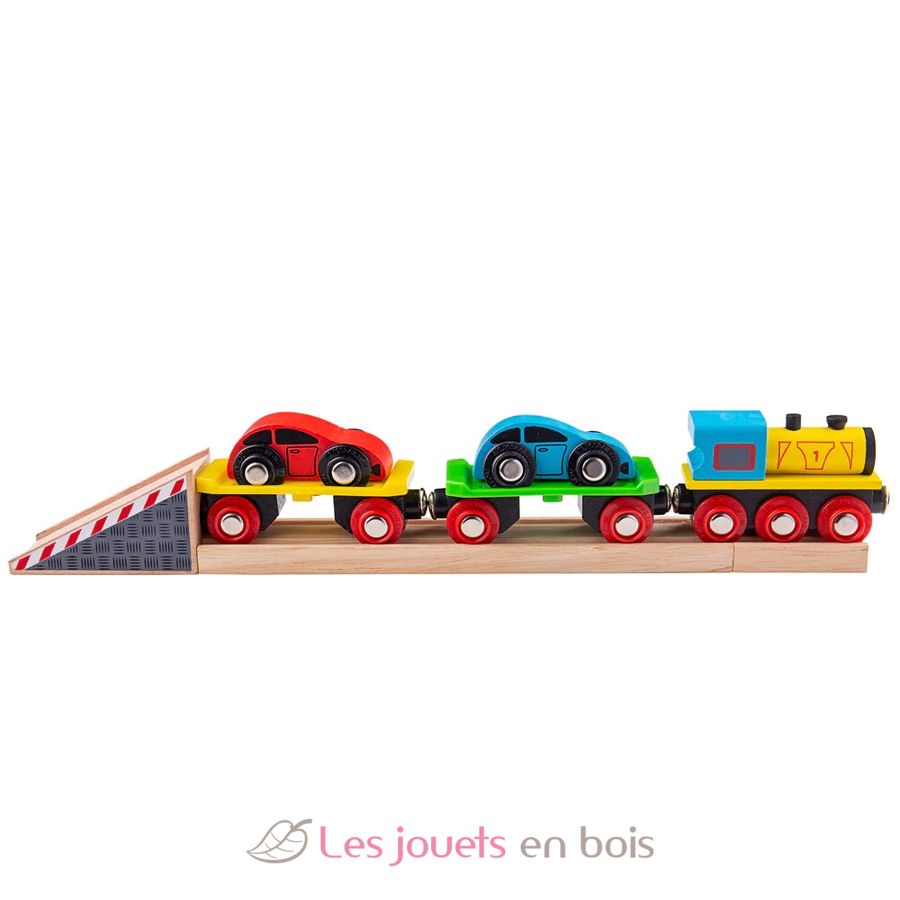 Este tren de transporte de coches es el complemento perfecto para un circuito de trenes de madera. Incluye una locomotora de madera, dos vagones, dos raíles y una rampa para coches.