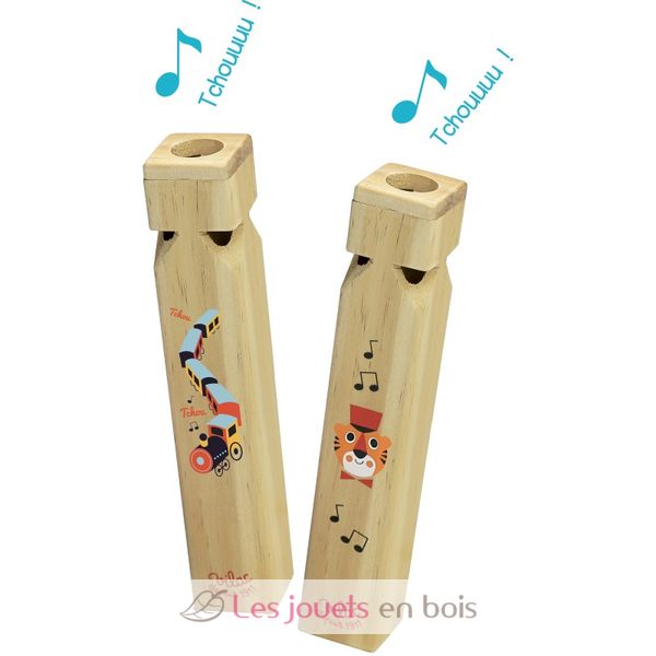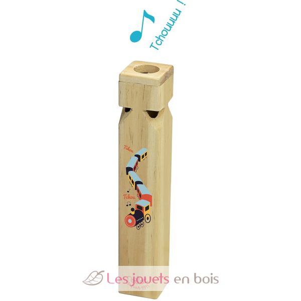 ¡Choo! ¡Choo! ¿Oyes el silbido del tren? Anuncia la llegada del tren a la estación con este silbato de madera que hace "Tchou Tchou". Disponible con dos diseños diferentes: un tren o la cabeza del simpático tigre. Disponibilidad de las decoraciones según disponibilidad.
