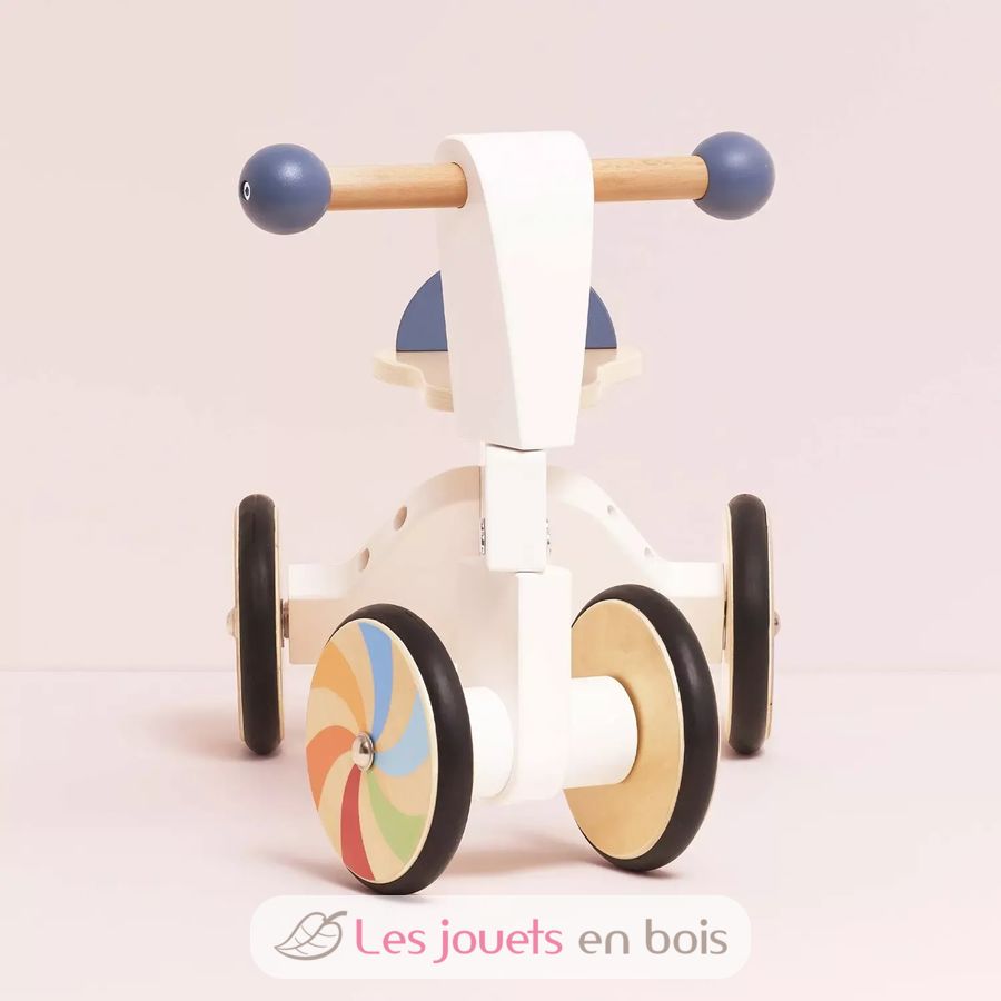 Hecho de madera con certificación FSC, este hermoso triciclo de madera presenta un elegante acabado blanco y ruedas con los colores del arcoíris.