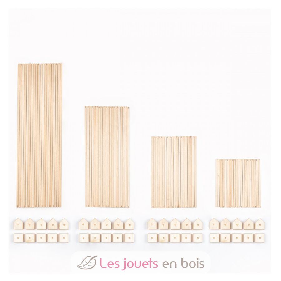 El Trigonos Maxi incluye 150 piezas: 20 cubos de unión, 20 triángulos de unión, 80 varillas de cuatro longitudes diferentes (14, 40, 60 y 80 cm) y 30 piezas de tela de algodón orgánico. Viene en una caja de cartón.