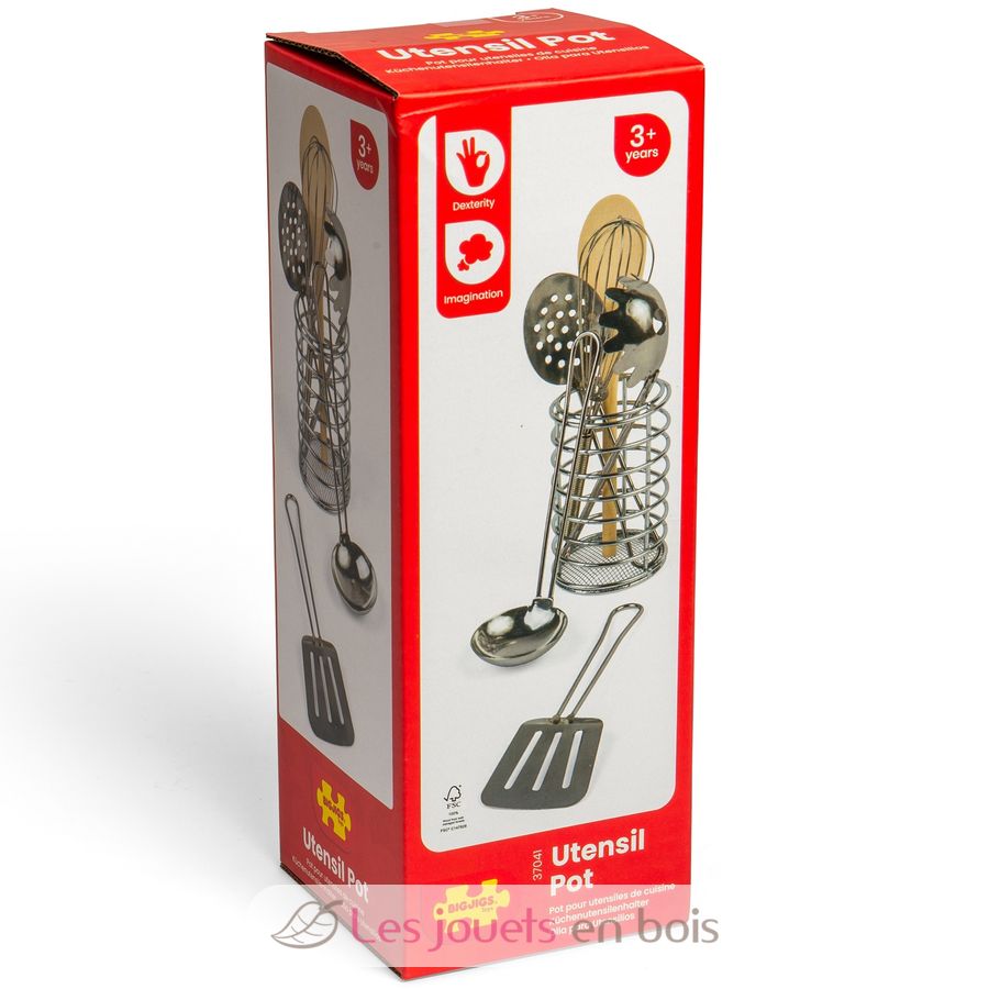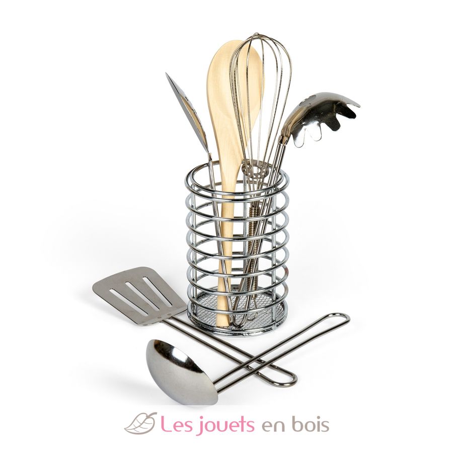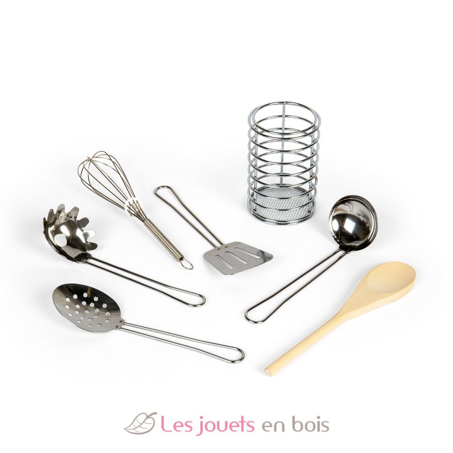 Diseñado para pequeños chefs, el set incluye seis utensilios de tamaño infantil: una espátula, una cuchara perforada, un cucharón, un batidor, una cuchara para espaguetis y una cuchara de madera, todo guardado en una pequeña olla de acero inoxidable.