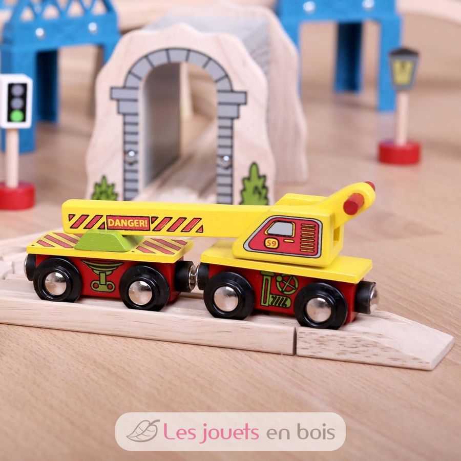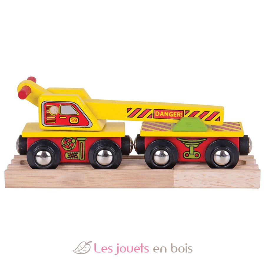 Este vagón grúa de madera amarillo está diseñado para girar y elevarse hacia el cielo. Consta de 2 piezas de juego, perfectas para completar un circuito de tren de madera.