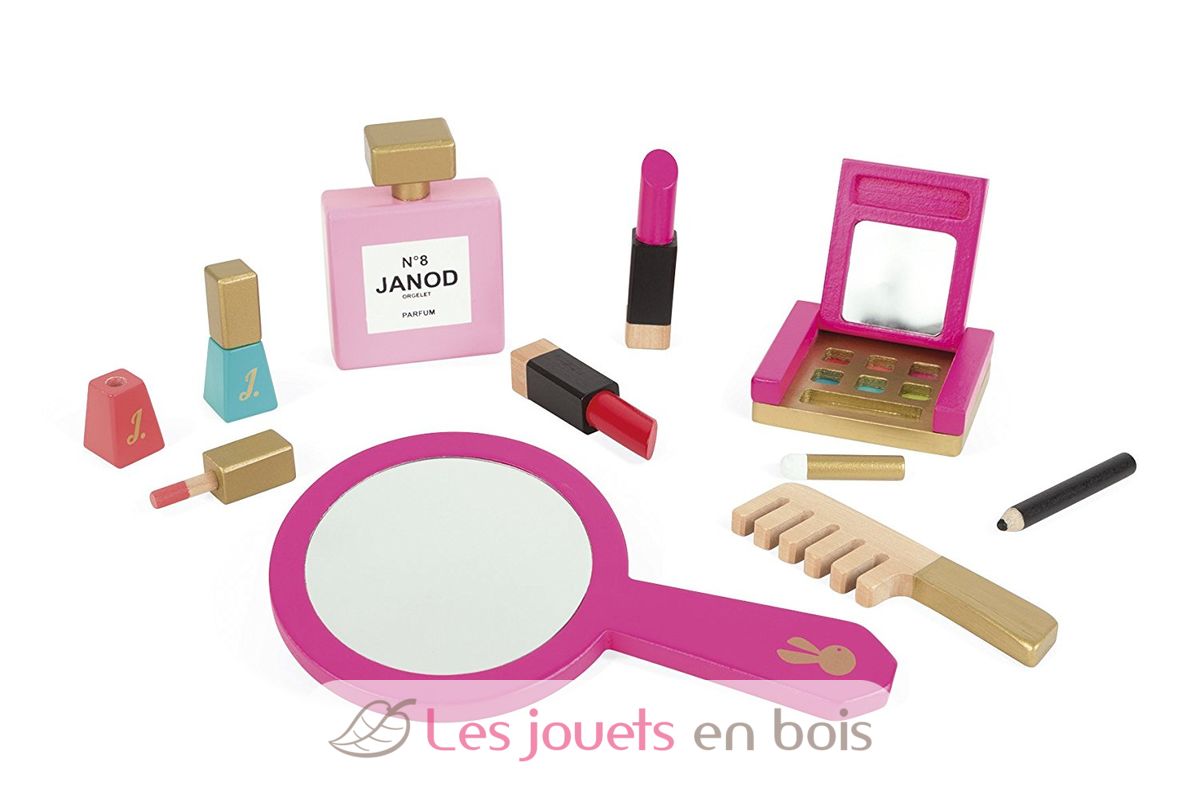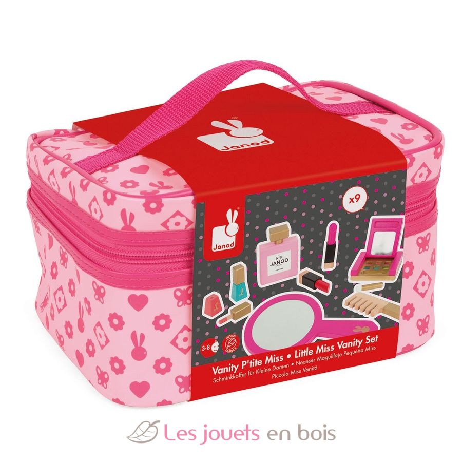 ¡Aquí tienes todo lo necesario para convertir la Miss de tu casa! Maquillaje, espejo, perfume... ¡A las peques de la casa siempre les ha gustado imitar a mamá! El neceser P'tite Miss contiene 9 accesorios de madera: 1 espejo, 1 paleta de maquillaje con pincel y espejo, 2 barras de labios, 2 esmaltes de uñas, 1 lápiz de ojos negro, 1 frasco de perfume y 1 peine. Vanity P'tite Miss de la marca Janod. Referencia 06514.