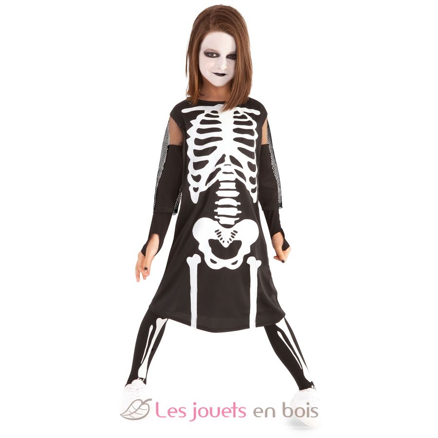 Este disfraz infantil incluye un vestido negro sin mangas con un esqueleto blanco estampado, puños negros con ribete de tul y medias estampadas.
